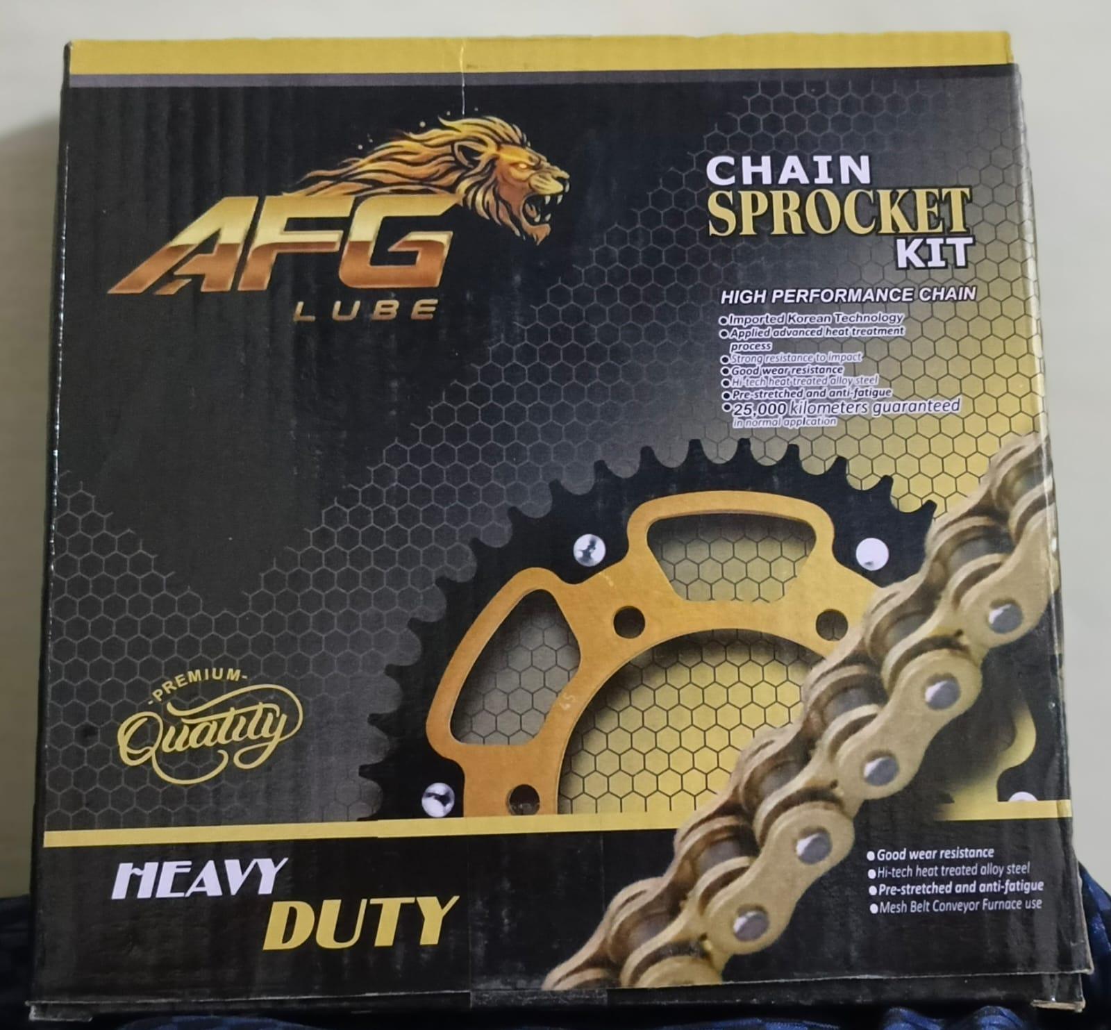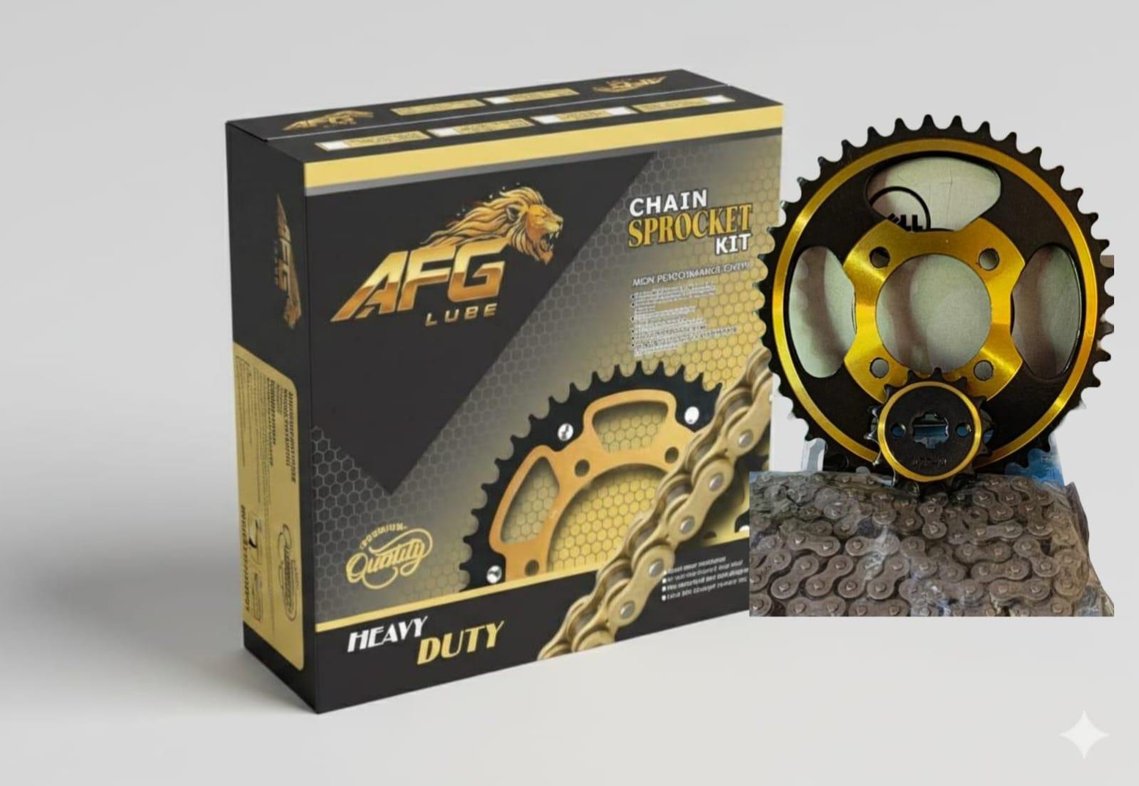 AFG Lube Heavy Duty Gold Chain Sprocket Set is engineered to deliver maximum durability and superior motorcycle performance. Manufactured using high-quality alloy steel and advanced heat treatment technology, this sprocket set ensures excellent resistance to wear, impact, and fatigue.