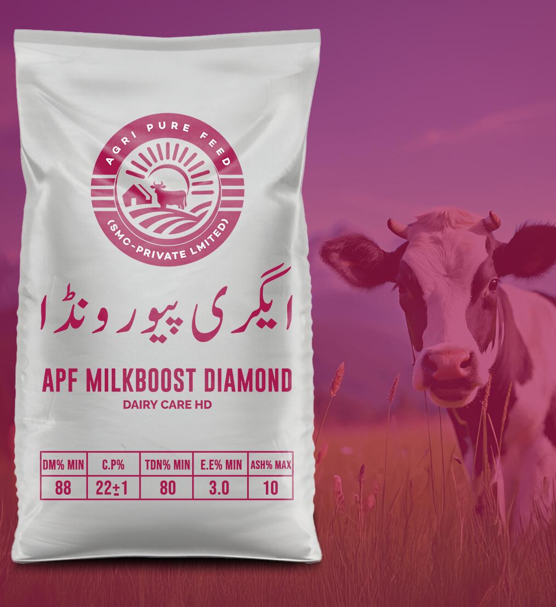 APF Milkboost Diamond 25 – Dairy Care HD is a high-performance pellet feed specially formulated for dairy cattle to maximize milk production and maintain superior animal health. It contains a rich combination of high-quality proteins, energy sources, vitamins, and essential minerals that help improve digestion, strengthen immunity, and support overall productivity.