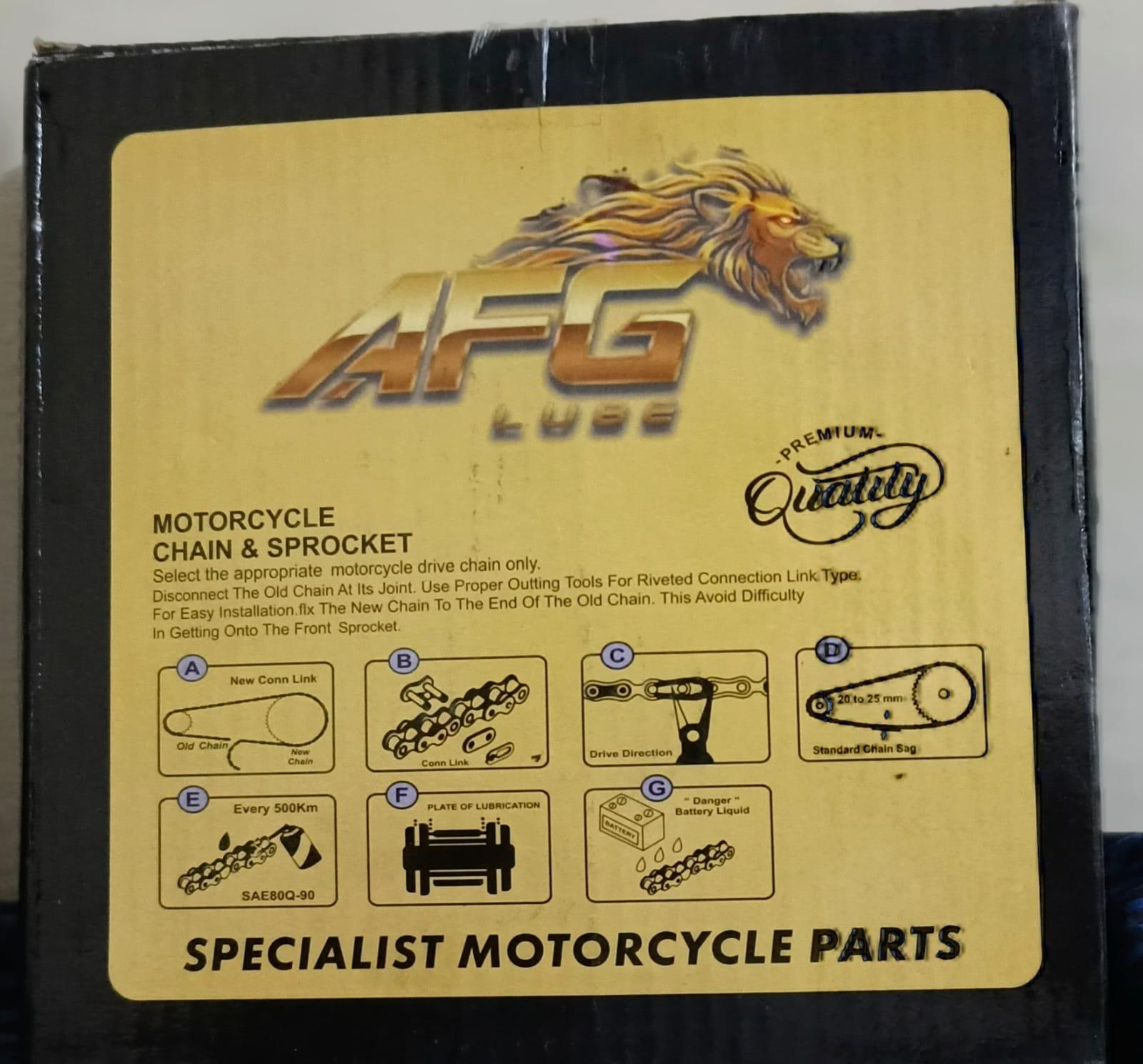 AFG Lube Heavy Duty Gold Chain Sprocket Set is engineered to deliver maximum durability and superior motorcycle performance. Manufactured using high-quality alloy steel and advanced heat treatment technology, this sprocket set ensures excellent resistance to wear, impact, and fatigue.