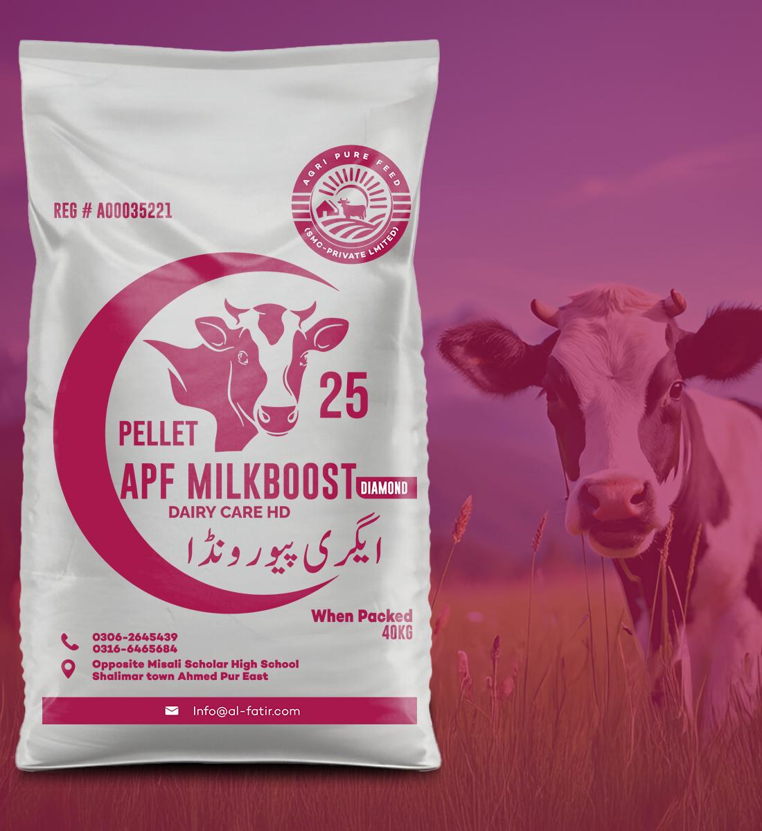 APF Milkboost Diamond 25 – Dairy Care HD is a high-performance pellet feed specially formulated for dairy cattle to maximize milk production and maintain superior animal health. It contains a rich combination of high-quality proteins, energy sources, vitamins, and essential minerals that help improve digestion, strengthen immunity, and support overall productivity.
